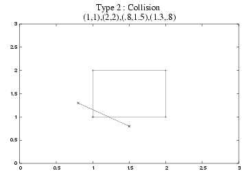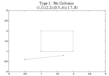 In the example we skip the y bounding test but it is for the example. x1>x2' == false x1'>x2 == false xmin=max(x1,x1')=1 xmax=min(x2,x2')=1.7 a=(y2'-y1')/(x2'-x1')=.3/1.2=.25 yleft'=(xmin - x1')*a+y1'=(1-.5)*.25+.5=0.6125 yright'=(xmax - x1')*a+y1'=(1.7-.5)*.25+.5=.8 yleft' < y2 && xleft' > y1 == false if yright' < y2 && xleft' > y1 == false return false No Collision !