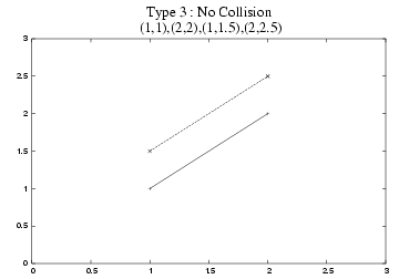 x1=1,x2=2,y1=1,y2=2,x1'=1,x2'=2,y1'=1.5,y2'=2.5 if x1>x2' : return false if x1'>x2 : return false a=(2-1)/(2-1)=1 a'=(2.5-1.5)/(2-1)=1 b=1-1*1=0 b'=1.5-(1*1)=.5 xsol=(1-1)/(1-(1)) Floating point exception (Oh no...) It does not collide No Collision !